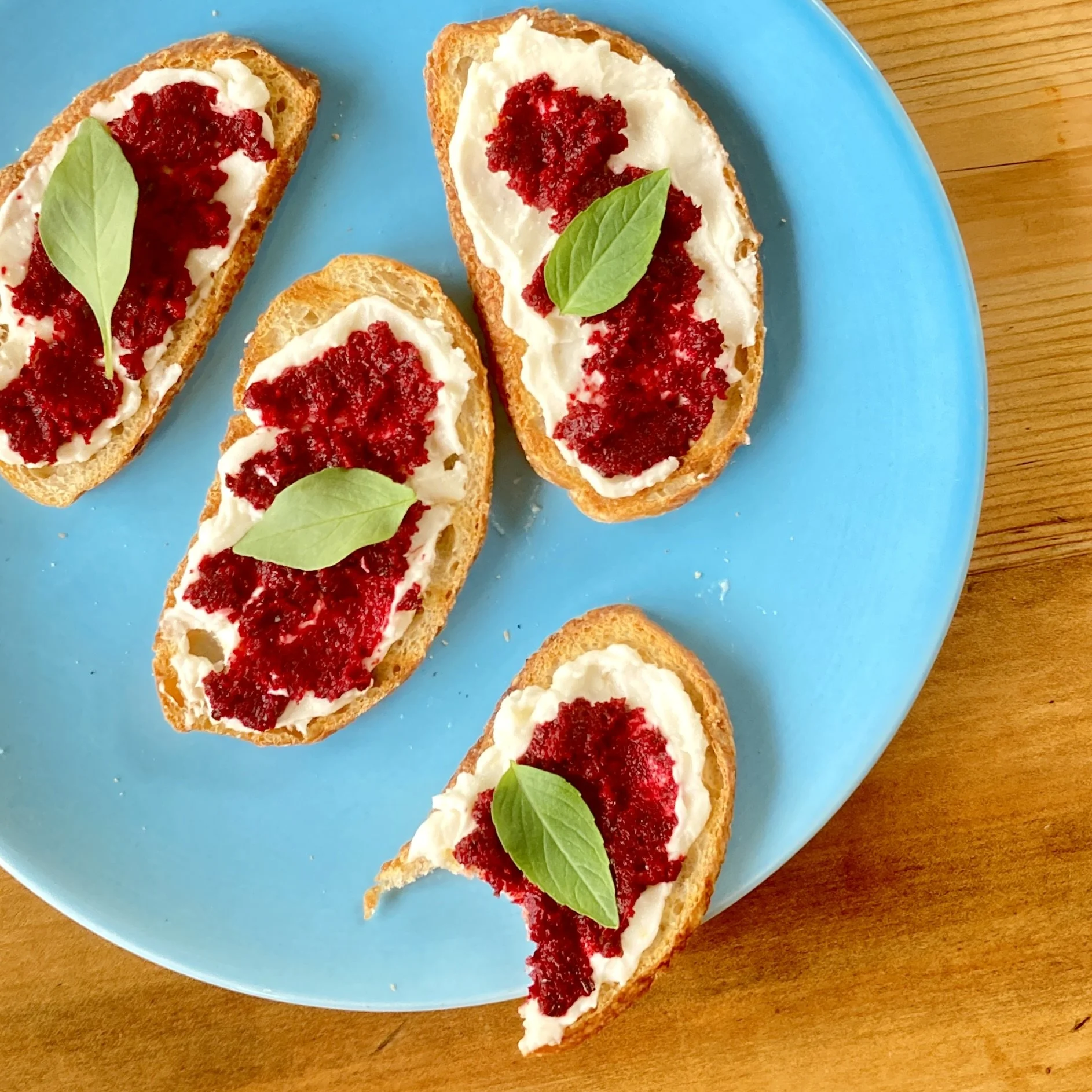 Delicious pesto based on the humble beetroot. Seasoned with parmesan and perfect paired with cream cheese on toast.