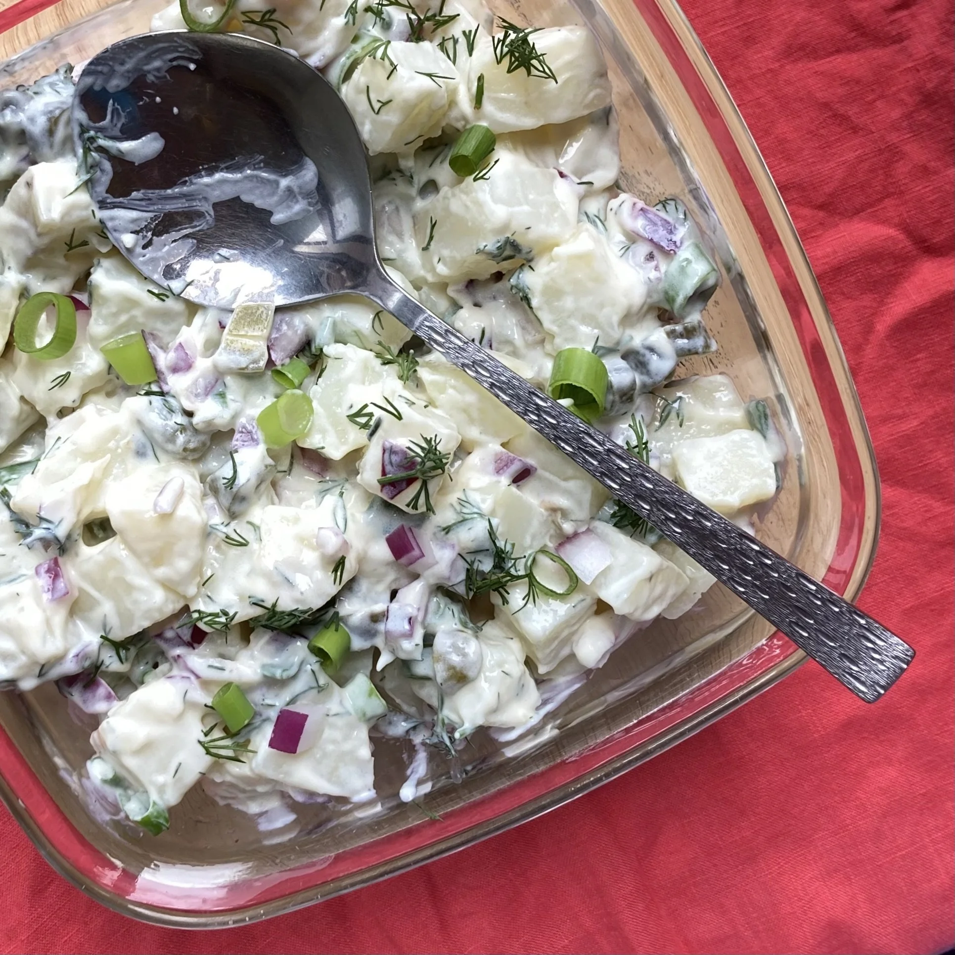 Feel free to mix up the mix-ins. You could add crispy fried capers, and maybe those tiny pickled onions instead of the gherkins (although the colour of the gherkins probably works better in this white dish than the pale pickled onions). Tiny pieces of crisp apple, celery or radish would be lovely. Add some paprika or turmeric to the sour cream if you’d like to give your salad some all-over colour.
