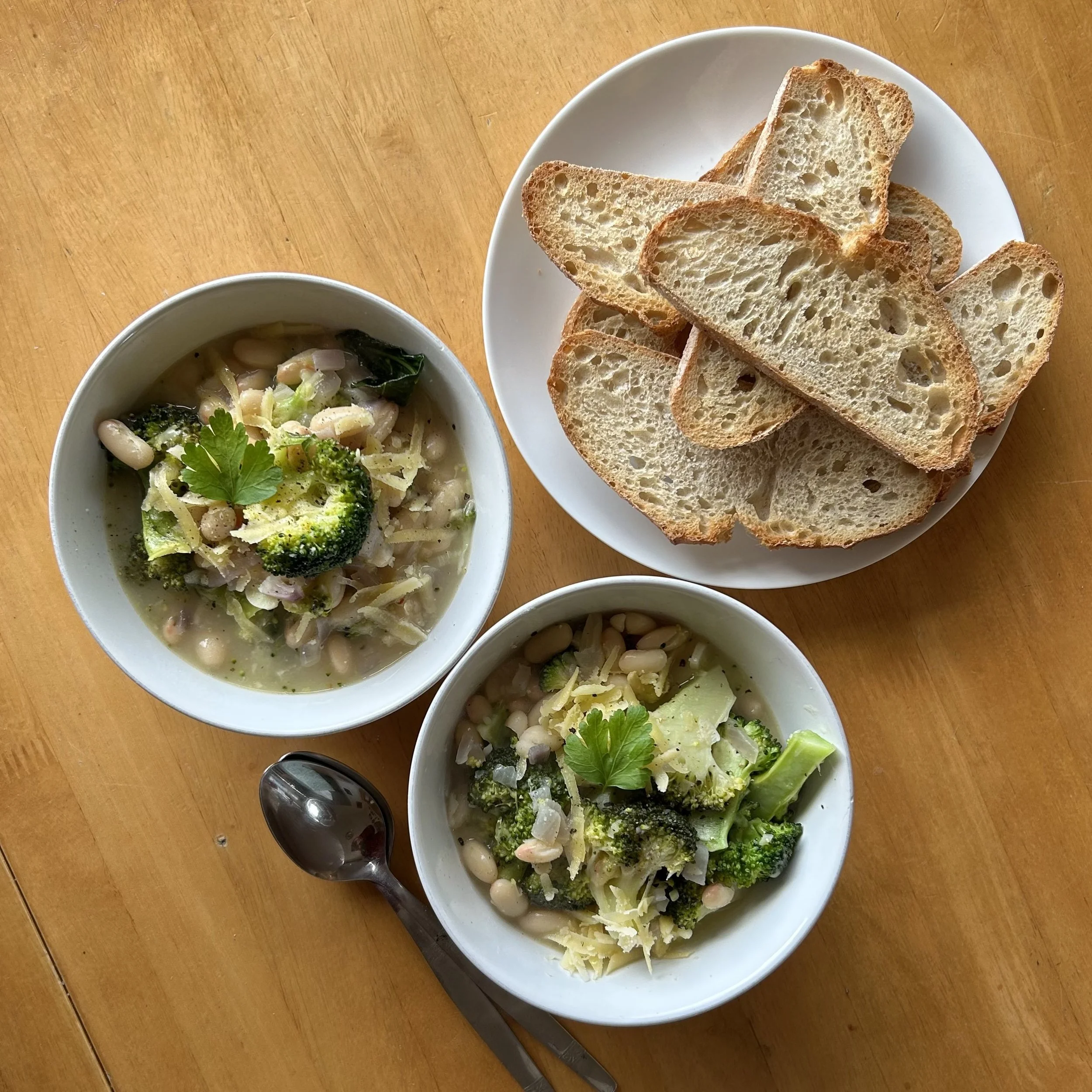4. Bring to a simmer, pop the lid on, and cook until the broccoli is as cooked as you want it. Stir regularly to ensure the beans aren’t sticking to the bottom of the pan. The stirring will crush some of the beans and help to thicken the liquid. It will only take about 5 minutes to cook.