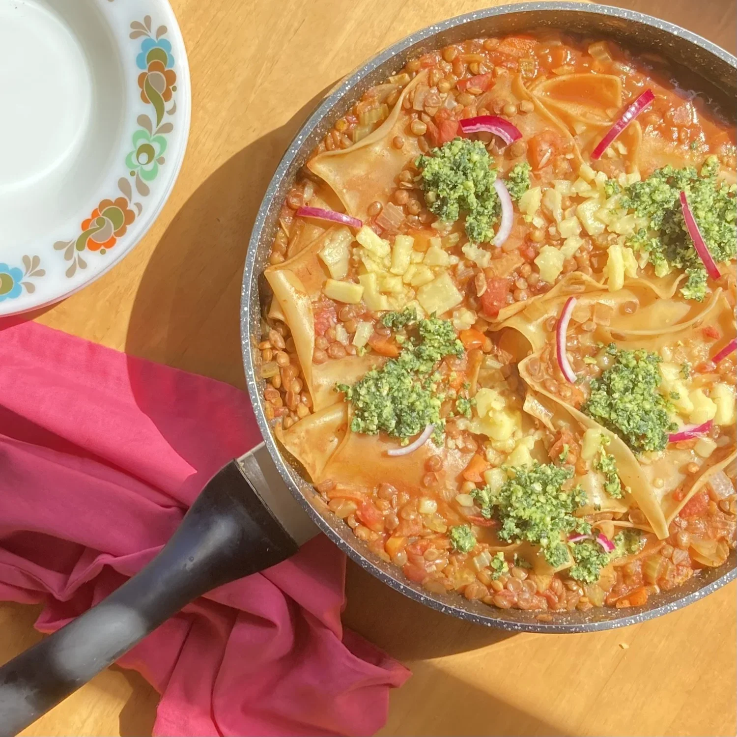 7. Before serving (in wide shallow bowls), dollop on kale pesto and, if you like, some quick pickled red onion and lashings of fresh black pepper.